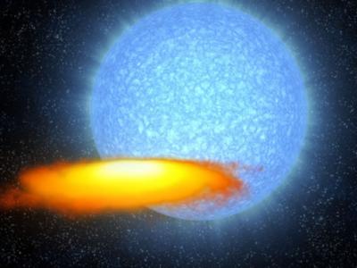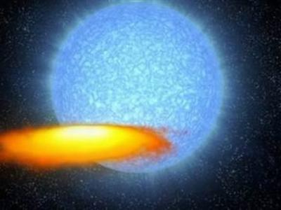 “M33 X-7”双星系统所产生的巨大质量黑洞就隐藏于这个烤薄饼状的物质圆盘中明亮...