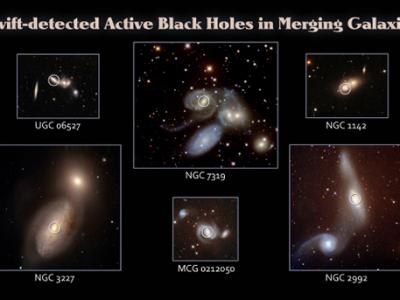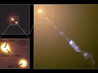 哈勃太空望远镜拍到的清晰图片显示,一个超大质量黑洞位于距离它所在的星系中心较...