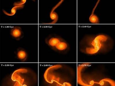 上图演示了两个同等质量的盘状星系碰撞过程的复杂动态演变过程。对暗物质、恒星和...