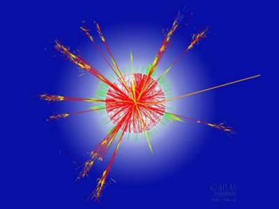 这张图片模拟的是ATLAS里产生的黑洞。这个轨迹是模仿大型强子对撞机上的ATLAS探测...