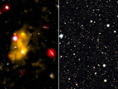 巨大气体云团(左图)因来自其中心的特大质量黑洞的热量而发光。研究人员观测了名...