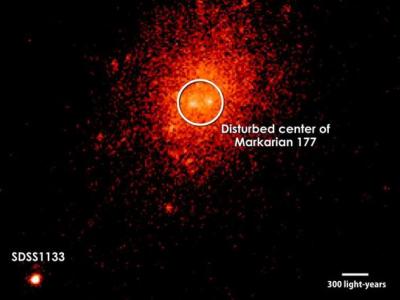 Markarian 177星系中央存在质量较大的黑洞,而左下角的SDSS1133可能是一颗流浪黑...