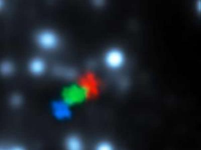 气体云遭遇超大质量黑洞。气体云在2006年、2010年和2013年的位置分别用蓝色、绿色...