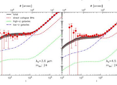 理论计算的第一代黑洞对红外背景辐射的角功率谱的贡献及实测值,左图为在波长3.6...