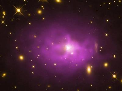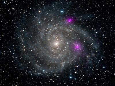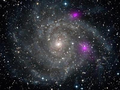 NuStar返回的数据为图中紫红色,叠加在显示有星系旋臂、恒星、尘埃和气体的光学图...