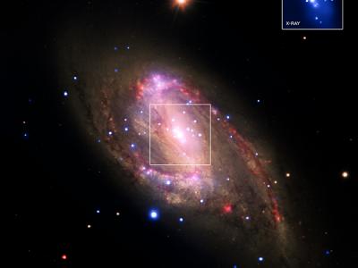 包含X射线(蓝色)、红外(红色)和光学数据(黄色)的NGC3627星系复合图片。 美...