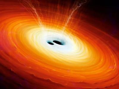 这是从一个旋转的黑洞周围的吸积物质的磁盘射出的喷流的模拟图像 据一项新的研究...