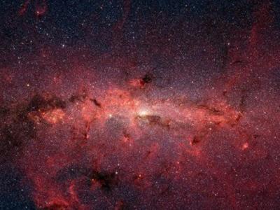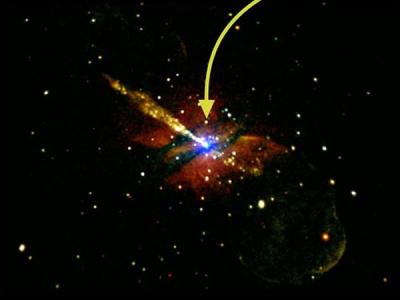 黄色箭头所指的是半人马座A的黑洞。红色代表低能量的光,绿色代表中等能量的光,...