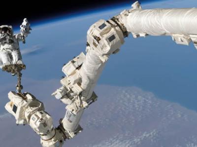 美国宇航员安德鲁·福斯特和理查德·阿诺德走出开放太空对国际...