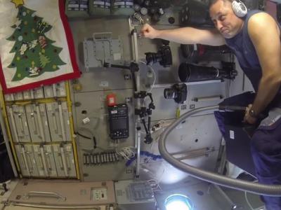 希卡普罗夫做出在ISS内骑吸尘机飞行的“创举”。希卡普罗夫骑...