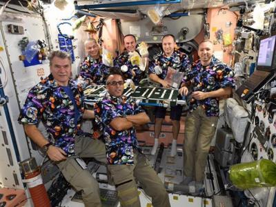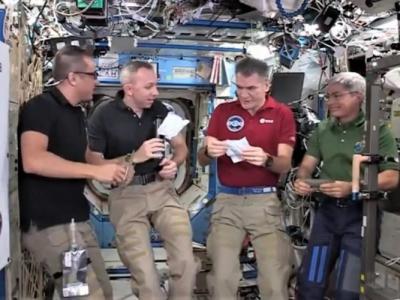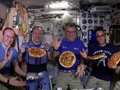 ISS的宇航员展示特别炮制的薄饼。宇航员合力制作美...