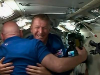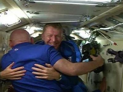 皮克(右)抵达国际太空站后,美国太空人凯利立即感受到他的拥抱热情。 太空三...