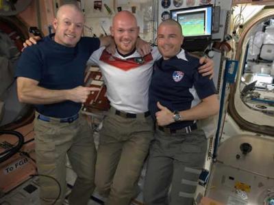 宇航员们在国际空间站观看世界杯决赛 德国宇航员在空间站内穿上德国国家队队服...