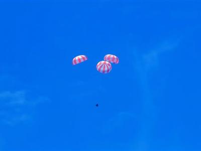 若田光一(中)返抵地球后面露笑容 太空船张开降伞,准备降落地面的一刻。 (...