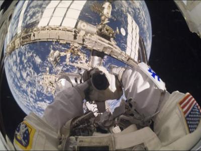 加莱特·莱斯曼在执行太空行走任务时,拍到了头盔中映射出来的蓝色地球以及空间站...