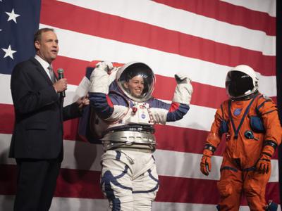 NASA展示最新宇航服xEMU。戴维斯(中)亲身穿着。戴维斯与同事击掌。戴维斯亲身示范...