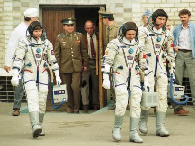 1991年联盟TM-12号任务组员,由左至又分别为英国女太空人沙曼,任务指挥官阿尔采巴...