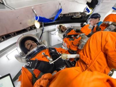 宇航员在猎户座实体模型内测试。NASA将推出新的求生宇航服。(...