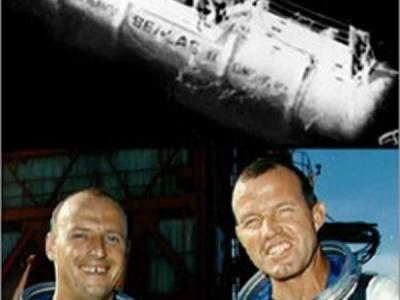 图像上部背景为海军的“海洋实验室-II”号,下为宇航员乔丹·库珀和皮特·康拉德...