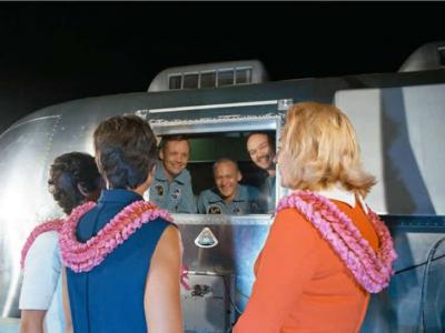 阿波罗11号任务的宇航员从月球返回地球后,他们的妻子在移动隔...