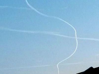 英国一架飞机在空中留下一道奇特的雾化尾迹