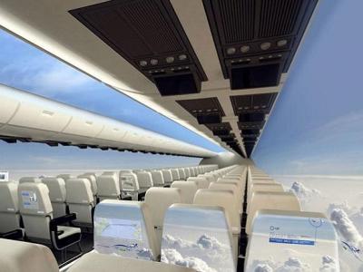 机舱的窗门由极薄、极清晰的显示屏代替。 乘客可在天空中上网 晚上亦能欣赏...