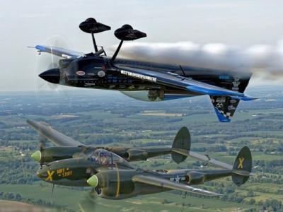霍兰特(上)的飞机在另一飞机上方倒转飞。 两机距离相当接近。 两机均以高速...