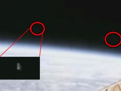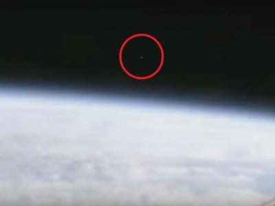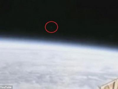 图中红圈标识物体被一些人认为是外星人驾驶的不明飞行器,这是国际空间站拍摄的视...