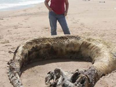 55岁的弗利彭斯是与丈夫在海滩上散步时发现这具骨架的。骨架至少有30英尺(约合9...