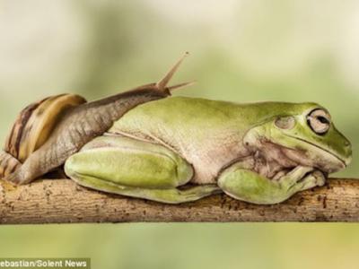 青蛙在树枝午睡 蜗牛从其身上爬过