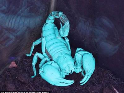 这张发光的蝎子照片拍自英国主题公园切辛顿冒险世界。这只老挝黑森子蝎在紫外光中...