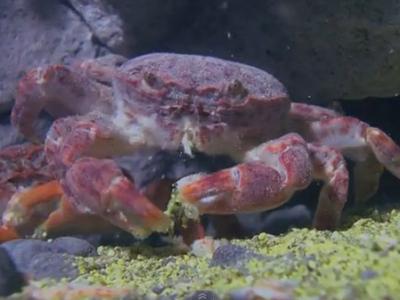 宜兰龟山岛特有生物「乌龟怪方蟹」生活在摄氏140度的热泉里。 乌龟怪方蟹躲在...