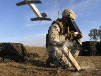 一位士兵正在发射“弹簧刀”无人机,它是从一个管子中发射,之后展开机翼,不久这...