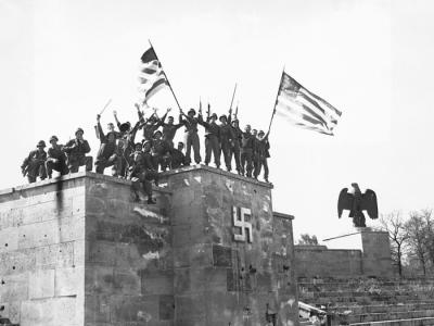 美国军队欢庆德国在1945年5月8号第一次有效力的无条件投降。 ...