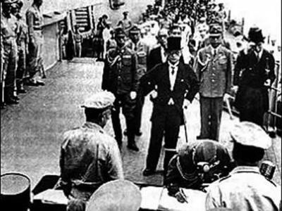 一九四五年九月二日,日本向盟军投降仪式在日本东京湾“密苏里”号军舰上举行。 ...