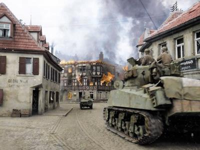 美国陆军装甲师士兵驾驶战车进入小镇。纳粹德军在雪...