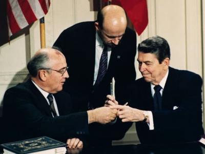 里根(右)与俄方签署销毁美俄中程核导弹条约。(神...
