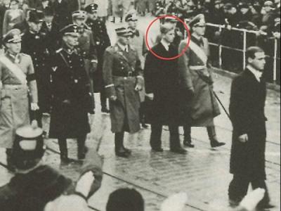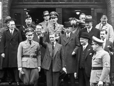 爱德华八世(前中)疑做纳粹敬礼动作。 爱德华八世在大批纳粹军官簇拥下做出敬...