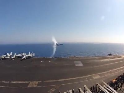战机在航母旁边掠过,突破音障一刻形成强大冲击波。 战机像子弹般飞近航母。 ...