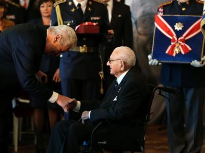 温顿(右)获泽曼(左)亲自颁授白狮勋章 由于温顿(前)已届高龄,家人本不愿他长途...