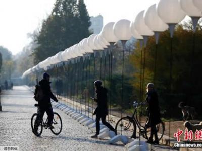 当地时间2014年11月6日,德国柏林,8000只发光氦气球沿原柏林墙修筑路线摆放,11...