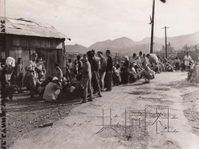 图为1945年9月24日,市民在长崎核爆中心地附近的食物配给所排队等待领取食物,由...