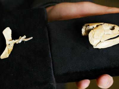 Dr John Long, Head of Sciences at Museum Victoria unveils the head (R) and ...