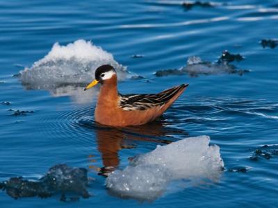 A red phalarope paddles between chunks of ice in the Arctic. Arctic summer...