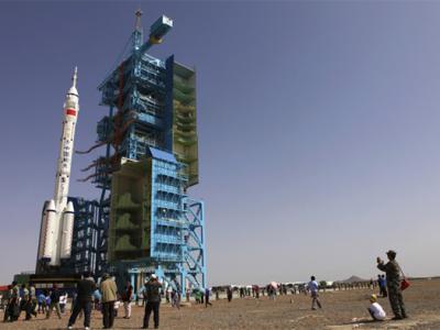 Visitors take pictures as China's Shenzhou 10 spacecraft and its carrier Lo...
