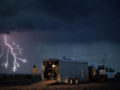 A weather researcher looks on as the sky lights up with a cloud-to-ground...