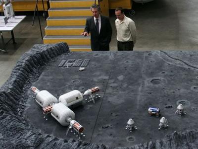 Robert Bigelow discusses a model of a Bigelow Aerospace lunar outpost. NAS...