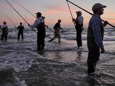 Surf fishermen try their luck for bluefish off Cape Hatteras, North Carol...