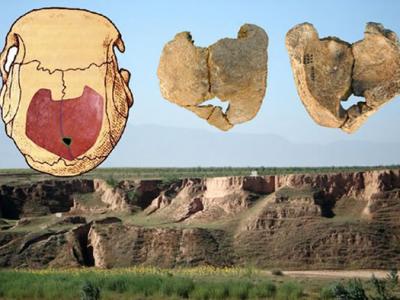Human skull fossils (inset) found at the Xujiayao site in China (background...