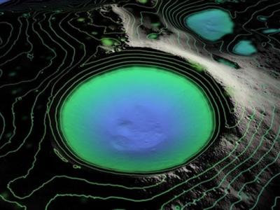 Elevation color coding lights up the inside of the moon's Shackleton crater...